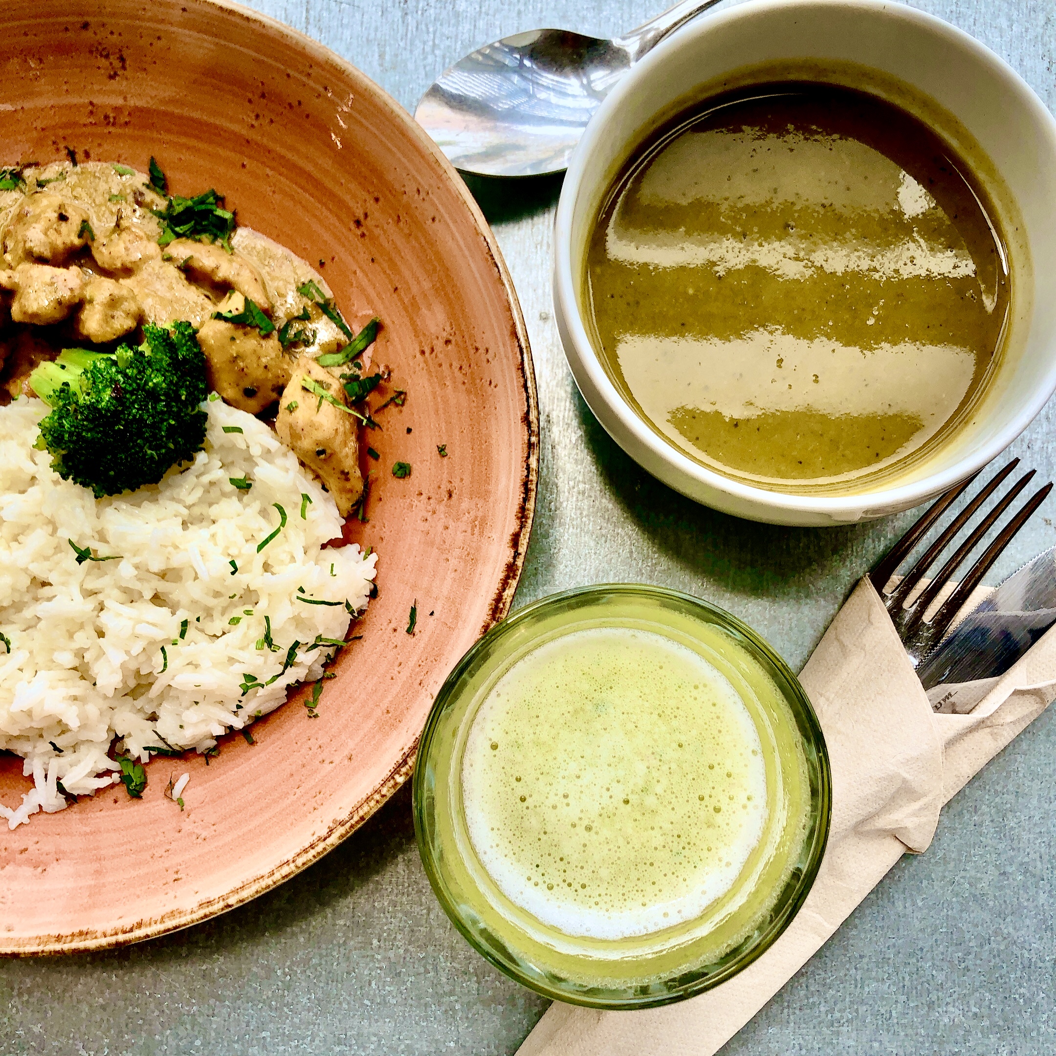 Este Menu de 3 produtos é constituído por 1 sopa, 1 prato ou 1 salada e 1 sumo natural.