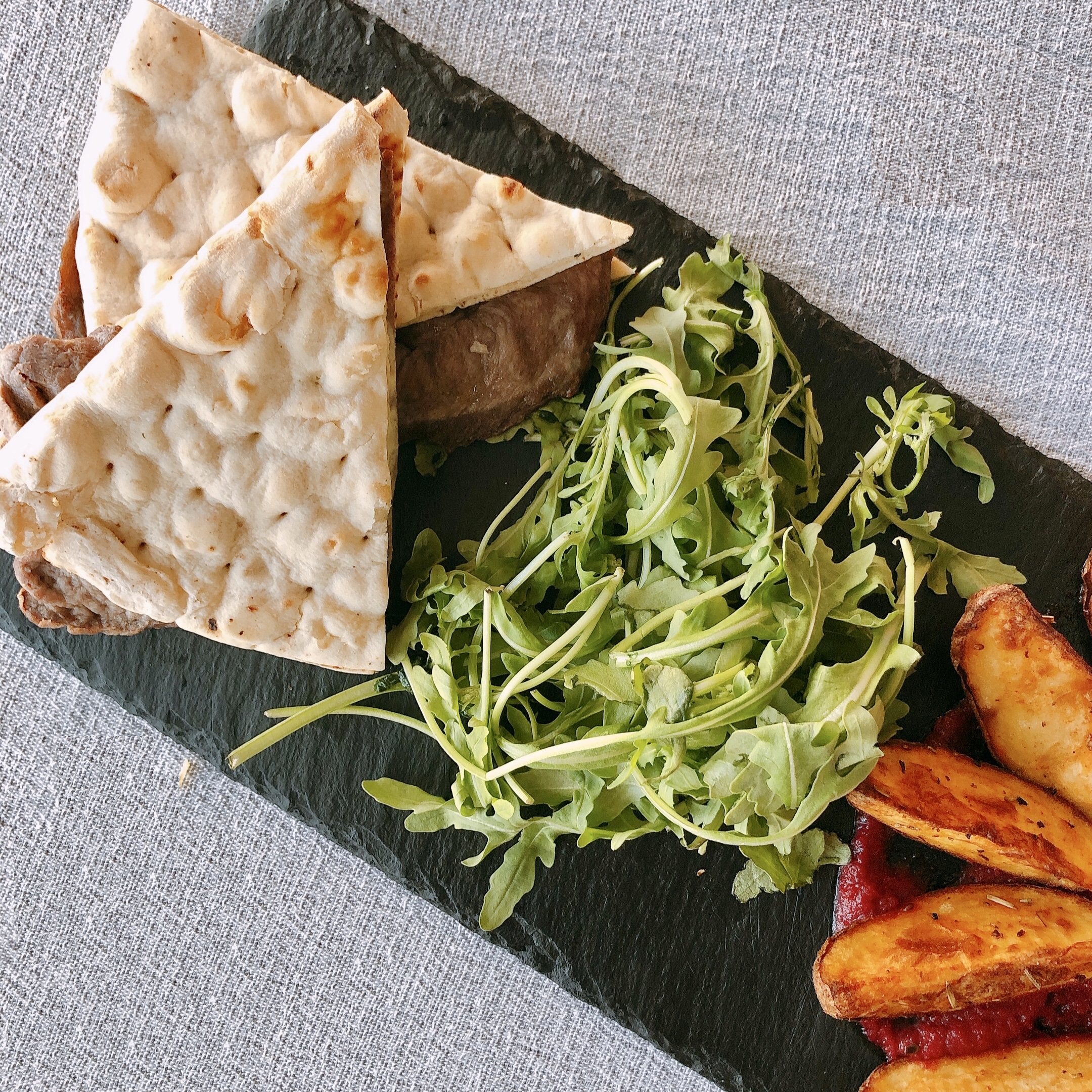 O nosso Prego é elaborado com rabadilha, pelo que a carne é tenra e muito saborosa. Acompanhamos com batatas assadas e ketchup de beterraba caseiro ;).